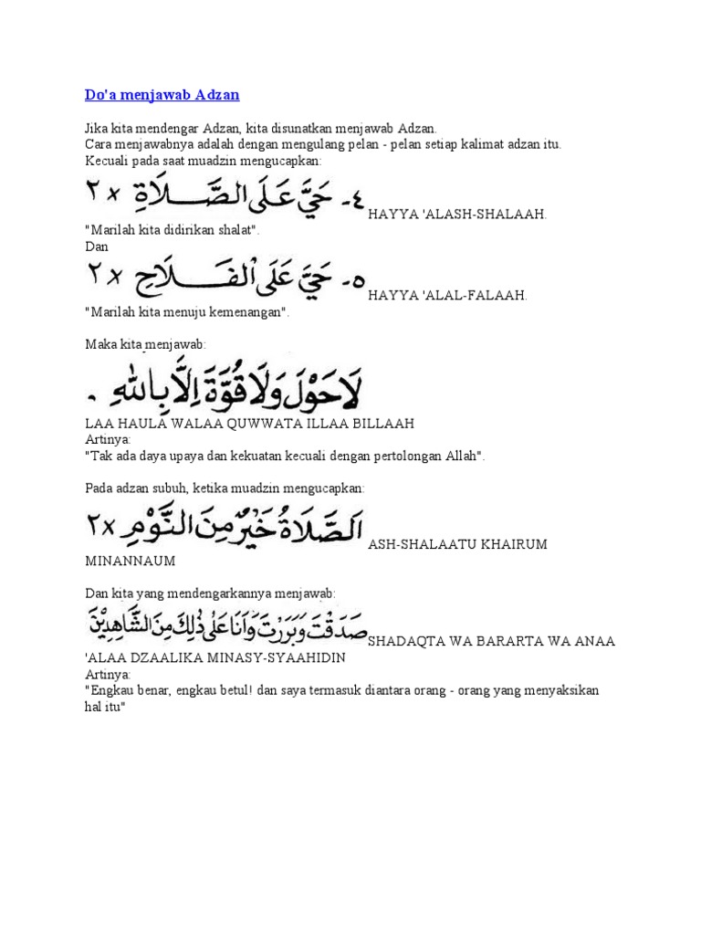 Untuk menjawab kalimat adzan ialah dengan kalimat yang sama seperti muadzin lantunkan kecuali pada bacaan. Dan wajib kifayah untuk menjawab kalimat adzan. Inilah keutamaan menjawab adzan, bacaan doa setelah azan dan artinya untuk menambah amalanmu. Cara menjawab adzan juga bisa dilakukan dengan mengucapkan beberapa kalimat berikut ini. Pengertian adzan pengertian adzan menurut bahasa secara bahasa adzan berarti pemberitahuan atau seruan.